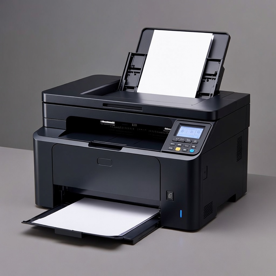 A black printer sits on a grey table. It has an open paper tray. A blank sheet is partially ejected. The setting is simple and modern.