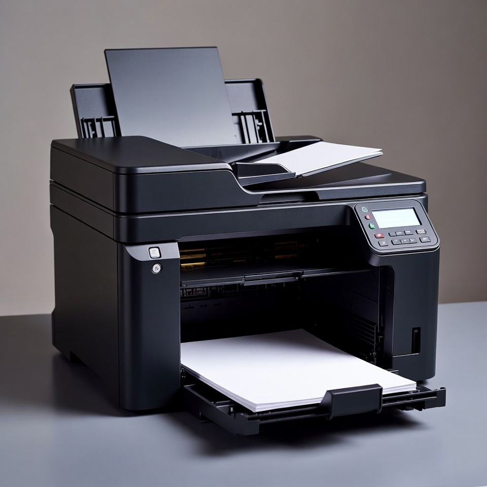A black printer sits on a gray surface. The paper tray is open, ready to receive new paper for printing tasks.