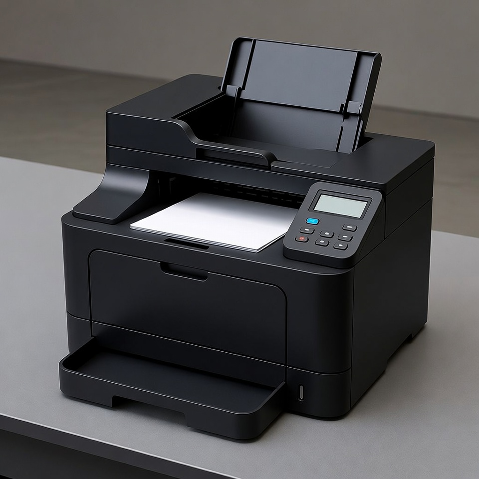 A black printer is placed on a table in an office. It has a display screen and paper tray. The printer is ready for use.