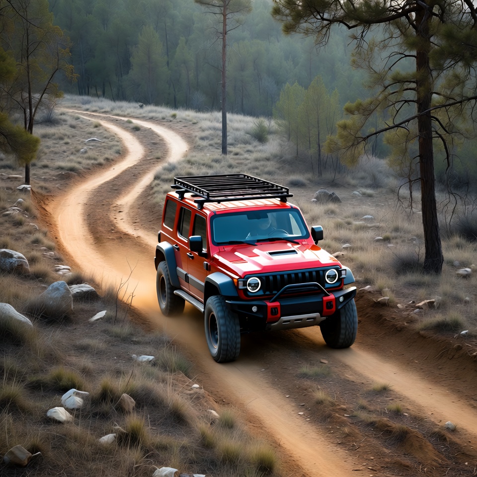 SUV, adventure, dirt road, driving, exploration, fresh air, journey, landscape, nature, off-road, outdoor, recreation, red vehicle, rocks, rural area, sunshine, terrain, travel, trees, winding path