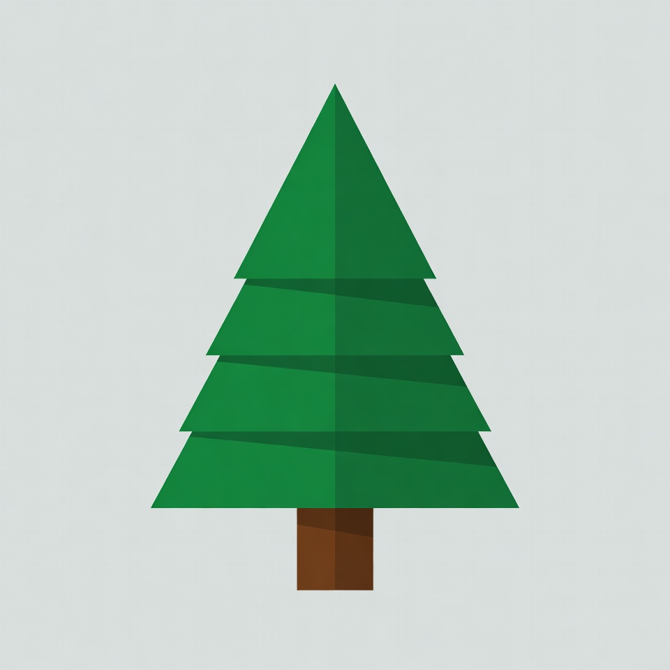 A green tree with layered branches stands on a brown trunk. The tree features a geometric shape and has a modern look.