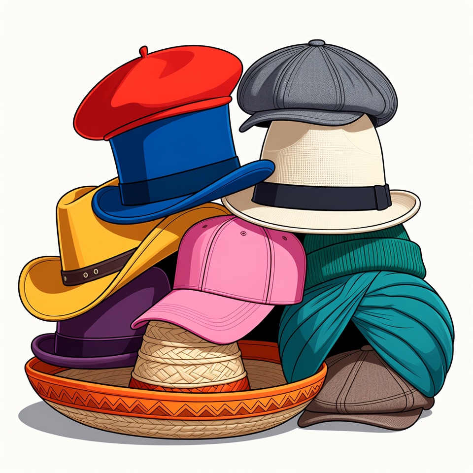 accessories, baseball cap, basket, beret, casual, clothing, collection, color, cowboy hat, design, fashion, hats, headwear, outdoor, stacking, straw hat, style, summer, winter, woven