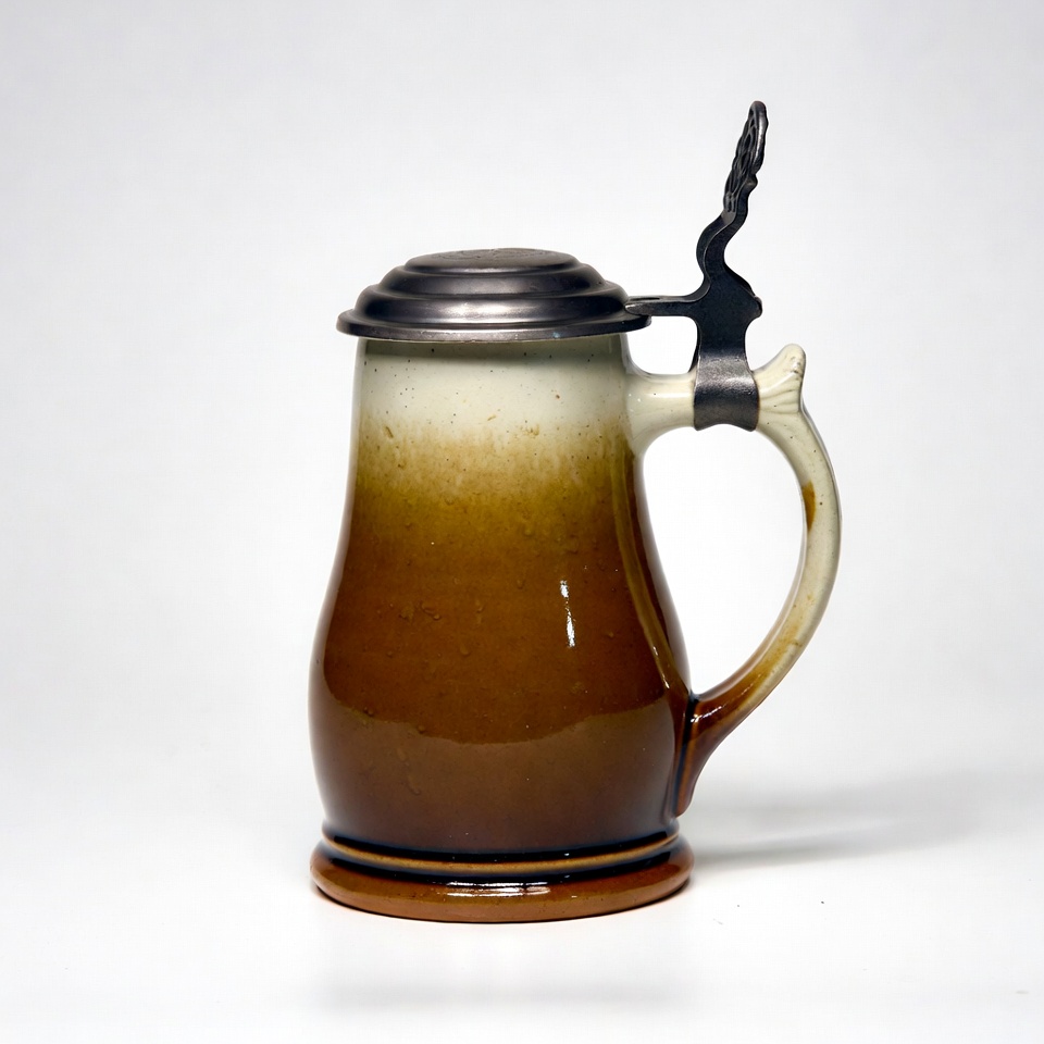A ceramic beer mug sits on a plain surface. It has a smooth finish and a metal lid. The mug shows a gradient of brown colors.