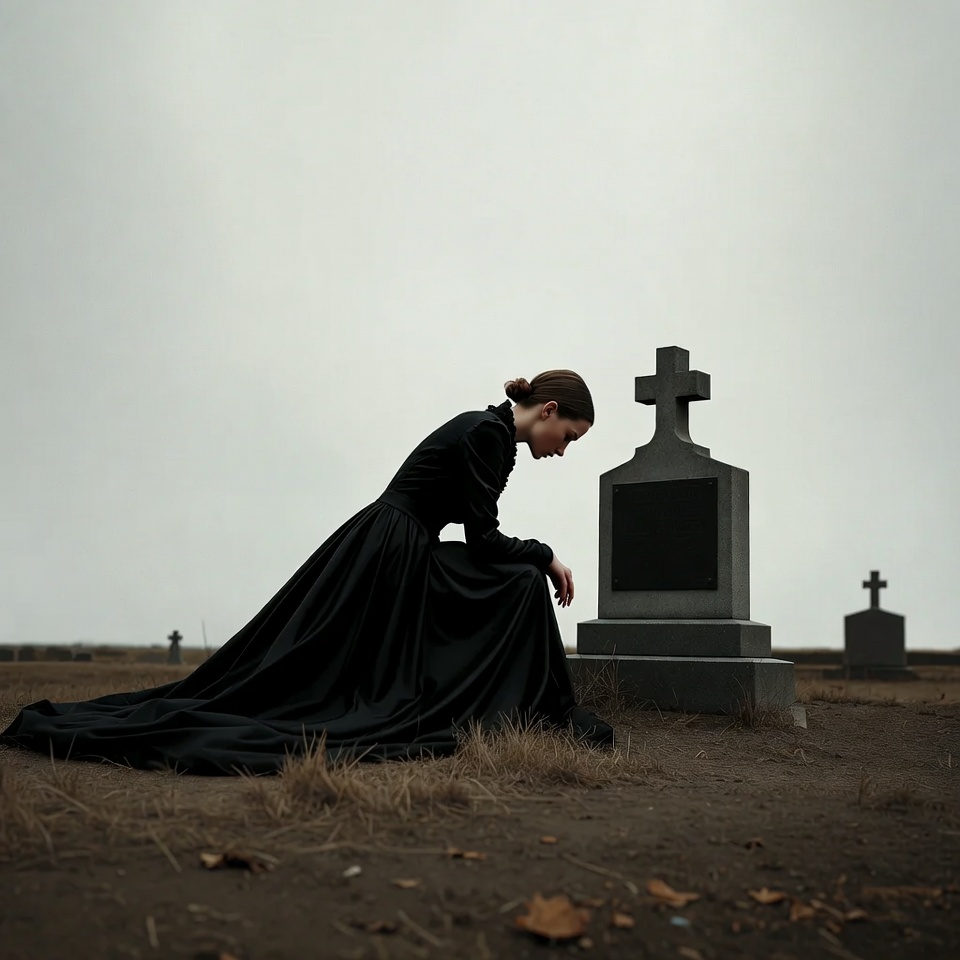 A woman in a long black dress kneels near a grave in a cemetery. She reflects quietly in the overcast light.