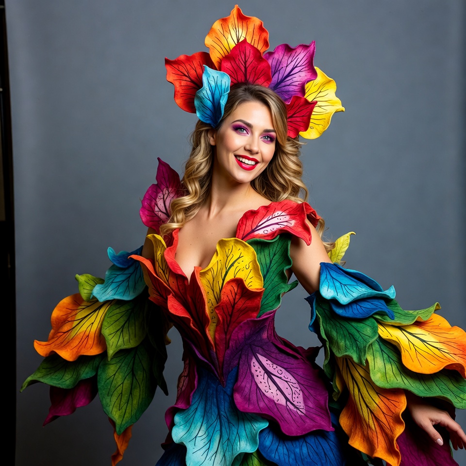 A dancer shows off a colorful costume made of leaf patterns. The outfit has vibrant colors like red, blue, green, and yellow.