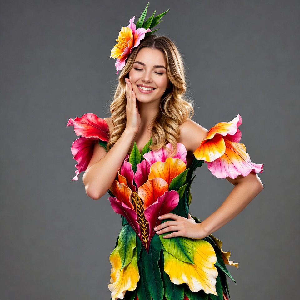 A woman poses in a flower costume with bright colors. She has long hair and a flower in her hair. The background is grey.