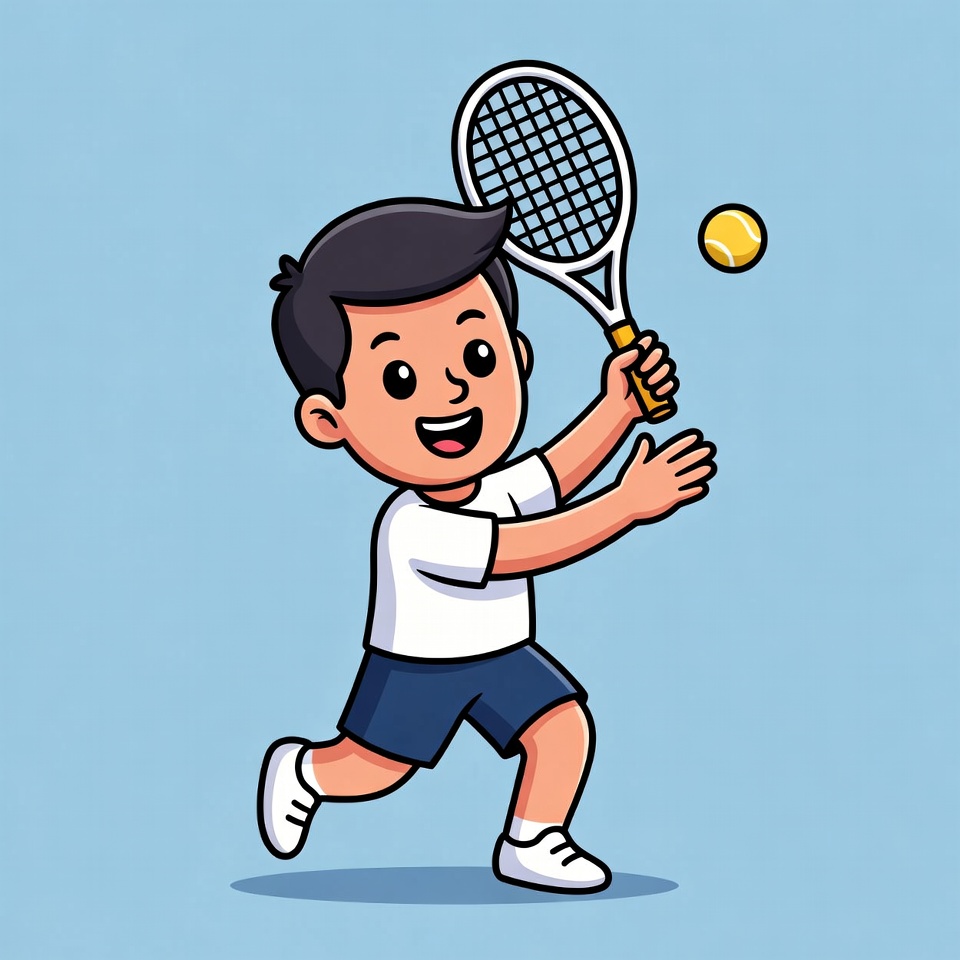 A boy swings a tennis racket to hit a yellow ball in a simple blue space, showing excitement during the game.