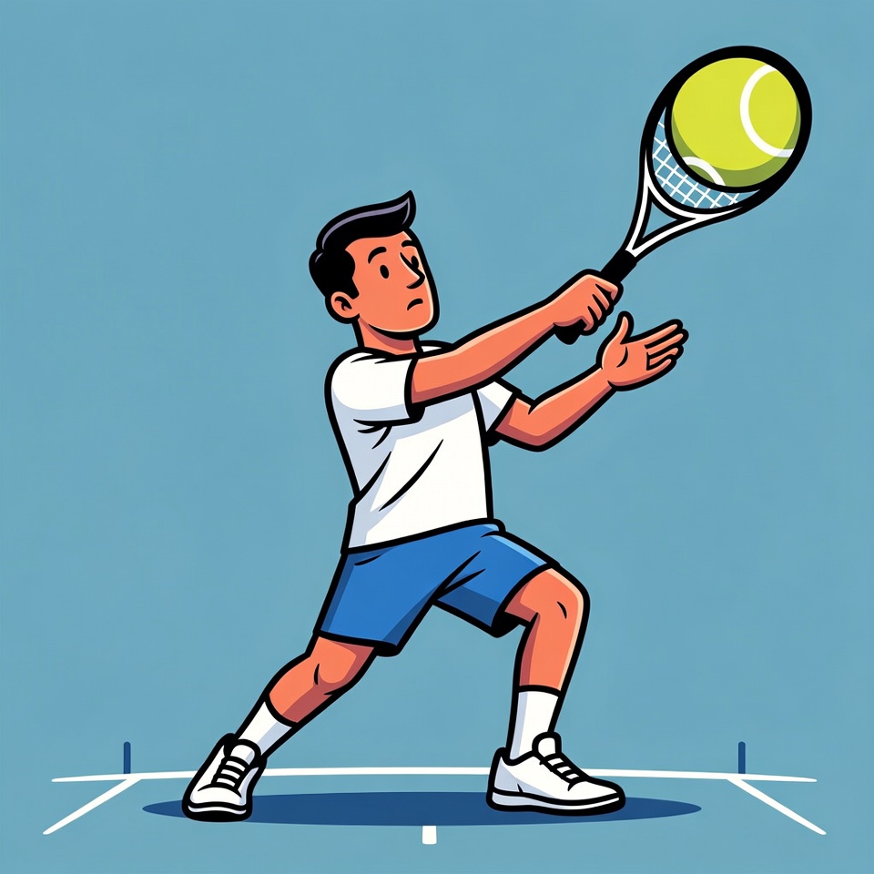 A player stands on a tennis court and swings a racquet to hit a ball during a match. The court is marked with lines and a bright background.