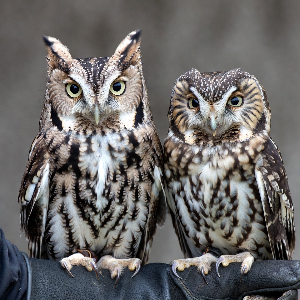 Two owls sit together on a gloved hand in bright light. The background is blurry, focusing on their detailed feathers and eyes.