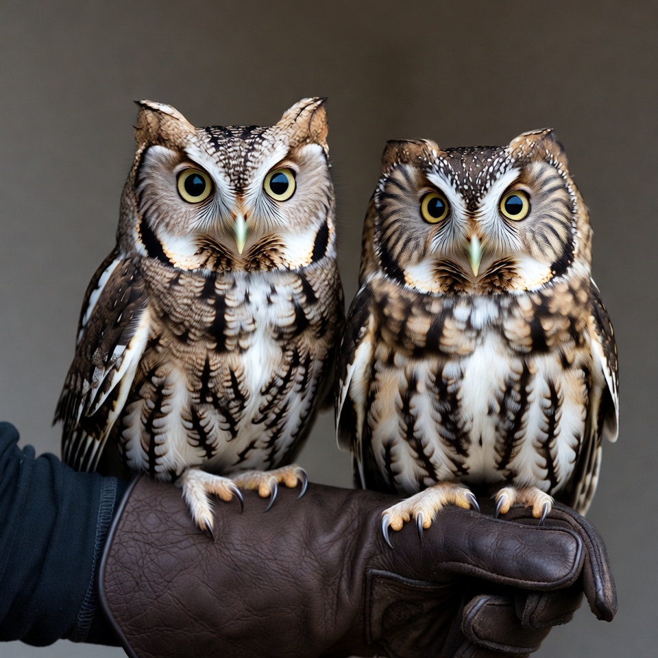 Two owls stand on a gloved hand. They are looking forward, displaying their feathers in good detail. The setting is indoors.