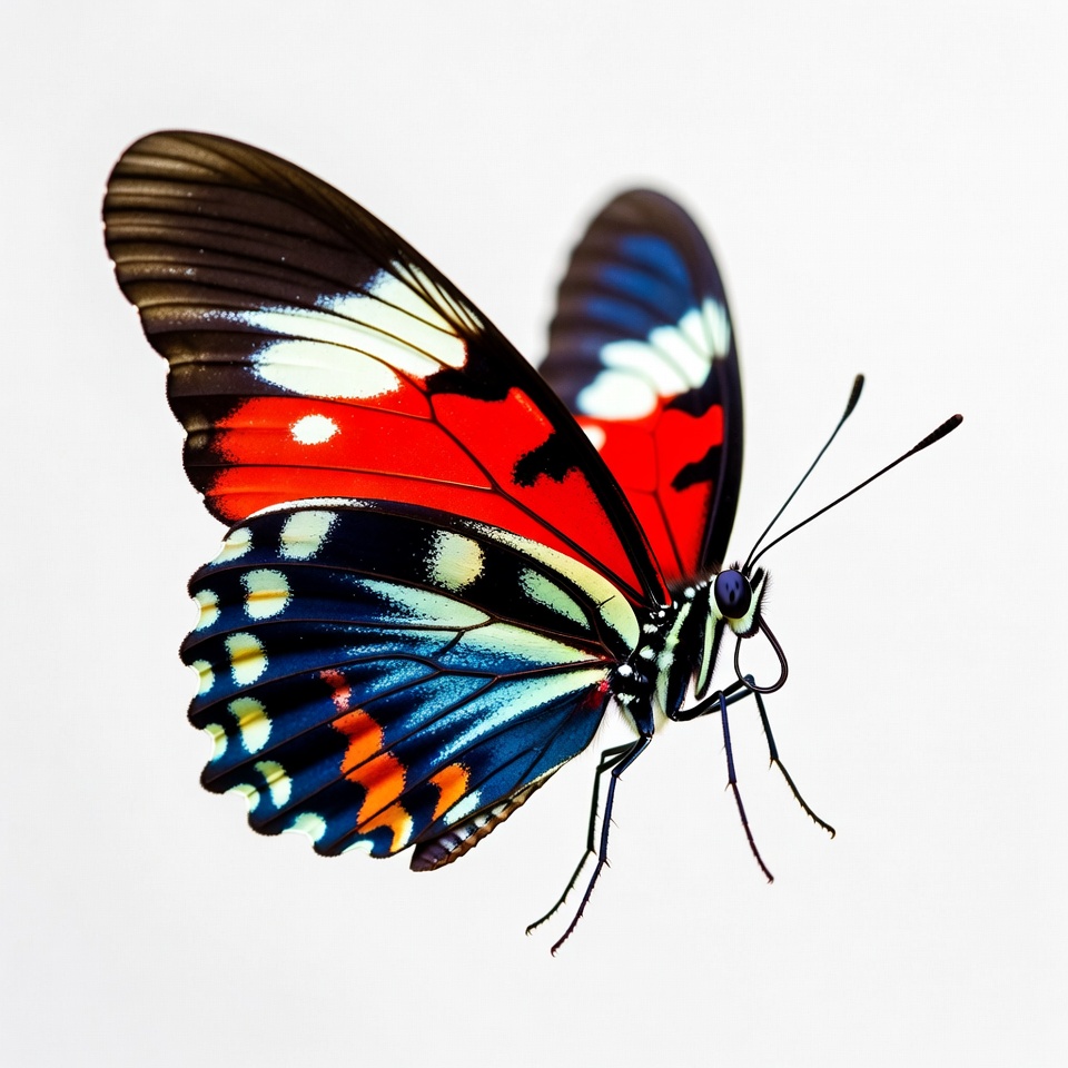 A butterfly with red, blue, and black wings is flying. Its wings show bright patterns and details. The background appears light and simple.