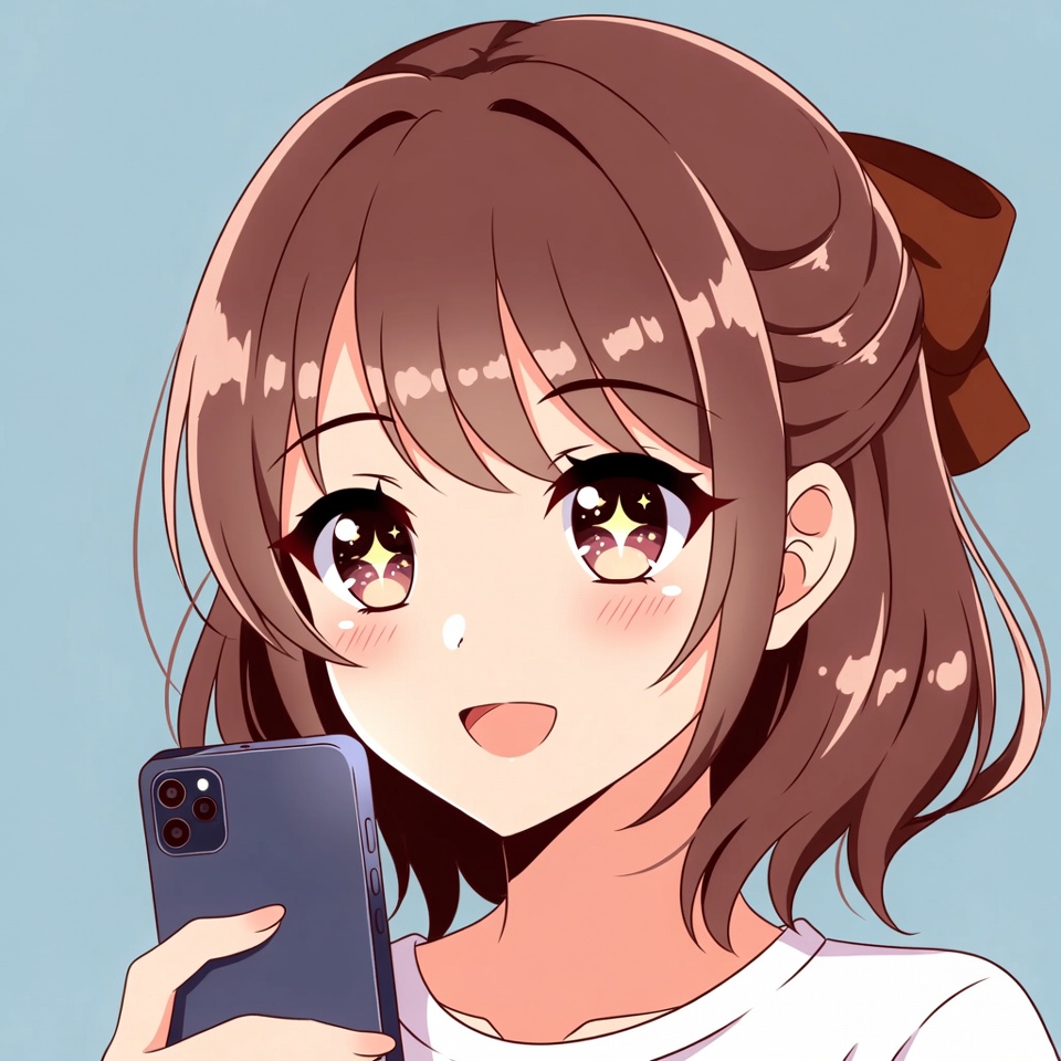 A girl smiling while looking at her phone. Her brown hair is styled neatly with a bow. The background is a simple light blue.