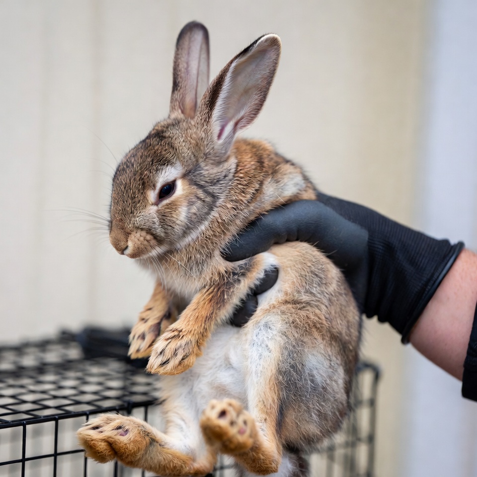 A person in gloves holds a small rabbit while standing near a cage. The setting appears to be indoors or in a shelter environment.