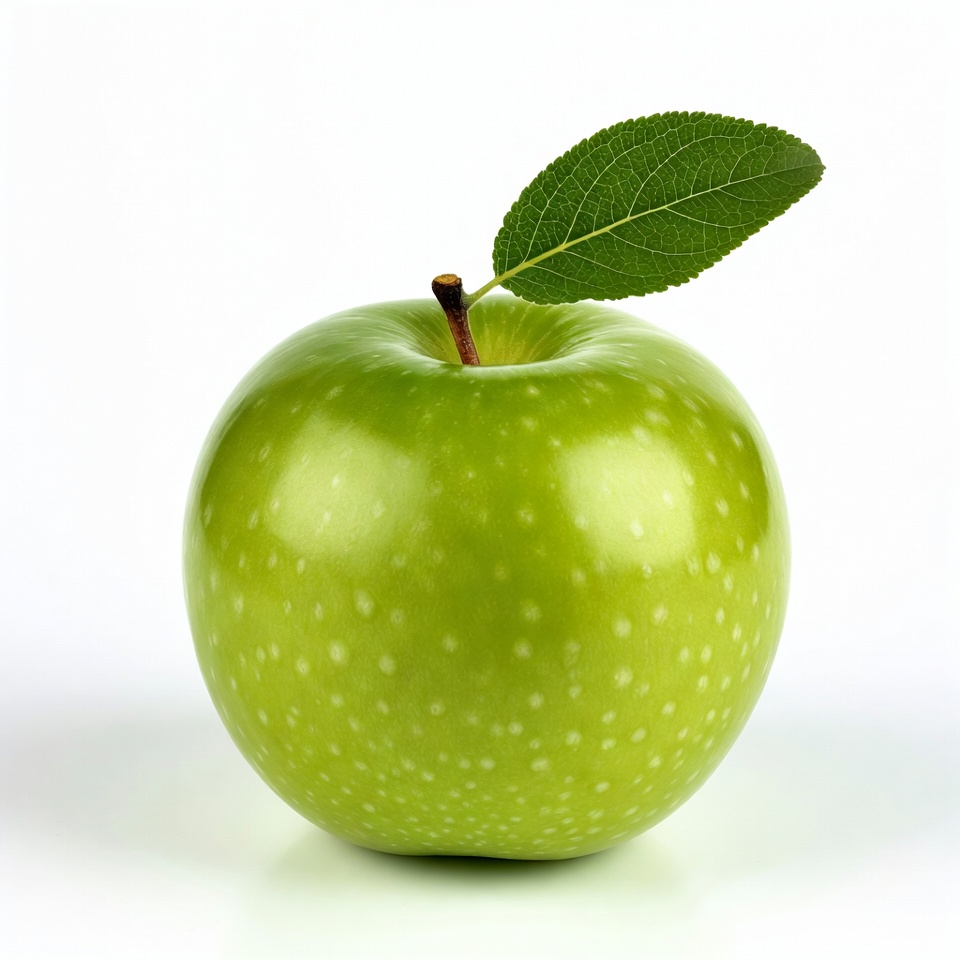 A fresh green apple sits on a white surface with a small leaf attached to its stem. This fruit looks natural and ready to eat.