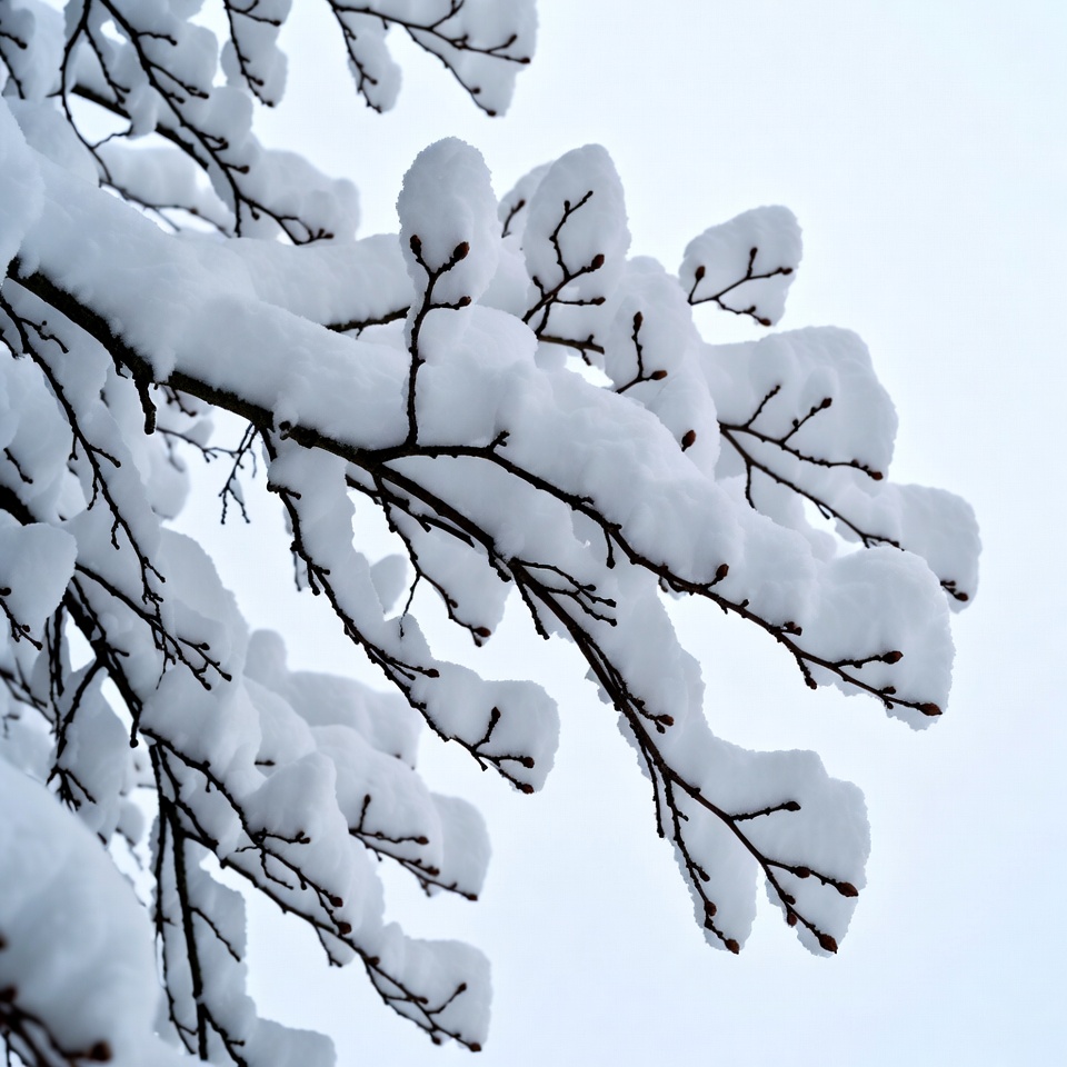 Snow blankets branches of a tree against a gray sky. The scene shows a typical winter day with snow accumulation on bare limbs.