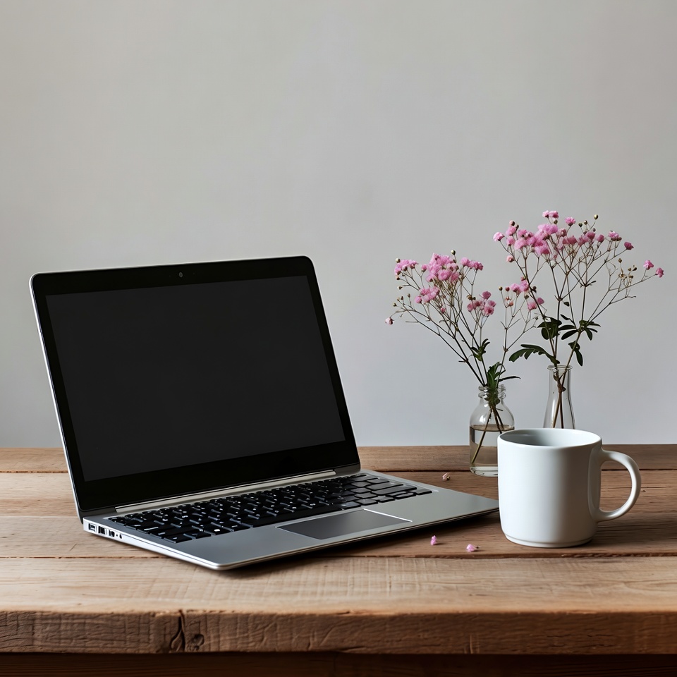 A laptop sits on a wooden table next to a white mug and small flowers in glass vases. The background is plain and light.