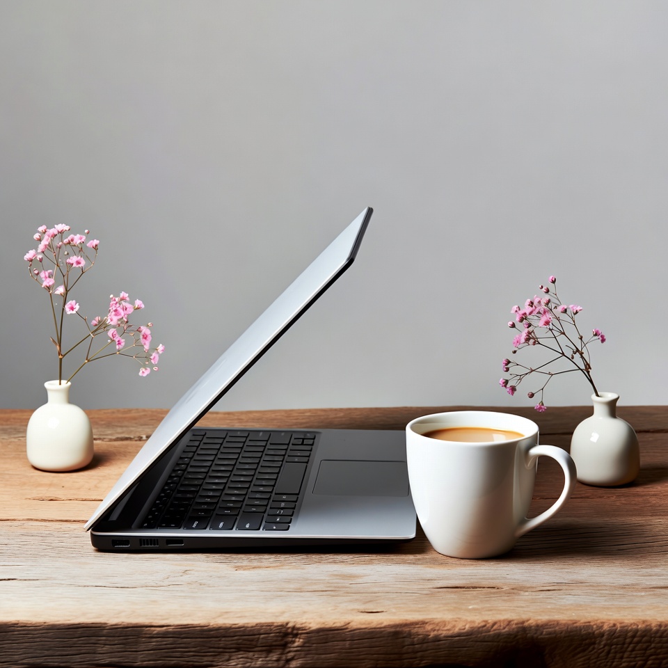 A laptop sits on a wooden table with a white coffee cup beside it. Small vases with flowers add decoration to the workspace.
