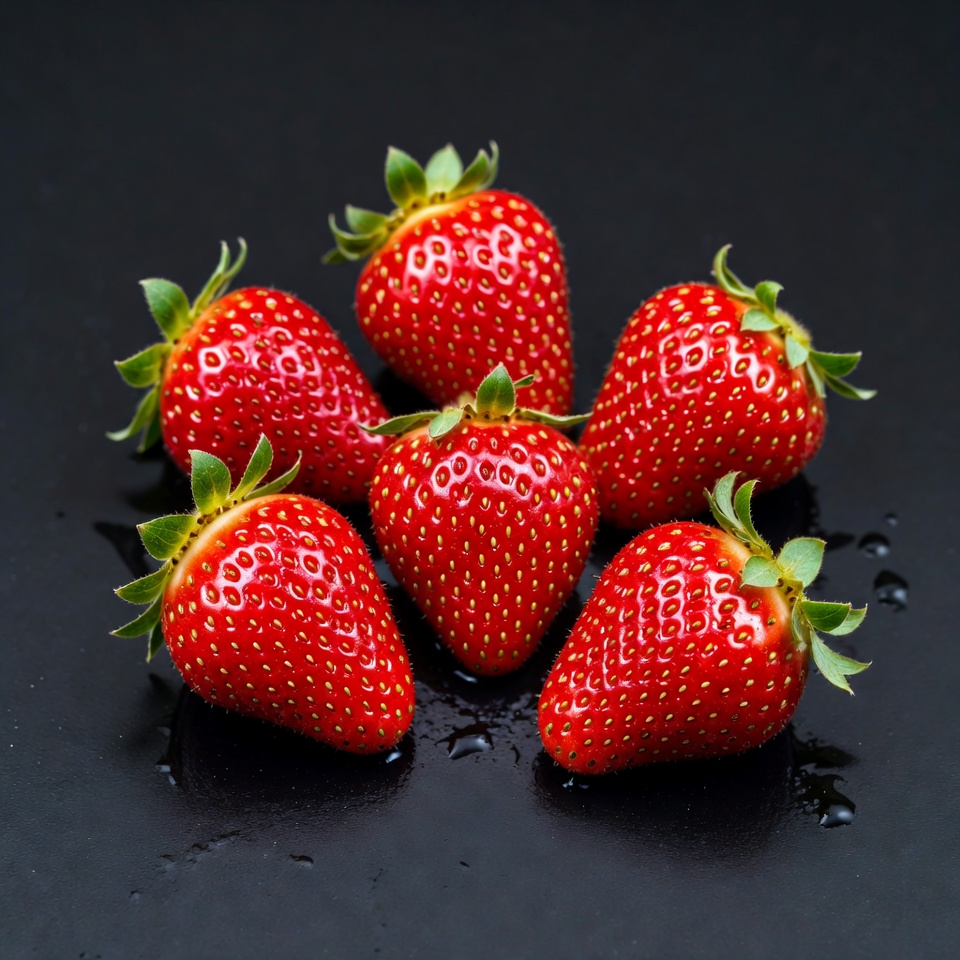 Six red strawberries are arranged together on a black surface, with droplets of water on their shiny skin.