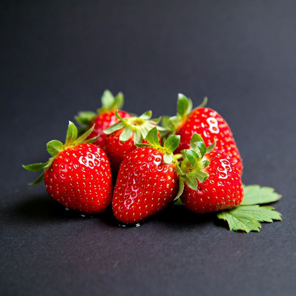 Fresh strawberries sit on a dark surface, showcasing their bright color and green leaves. They are ready to eat or use in recipes.