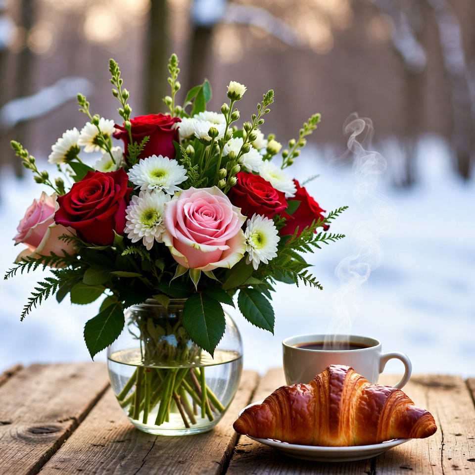 baking, breakfast, bright, coffee, croissant, daisies, drink, flowers, food, greenery, morning, nature, outdoor, roses, snow, table, vase, warm, winter, wood