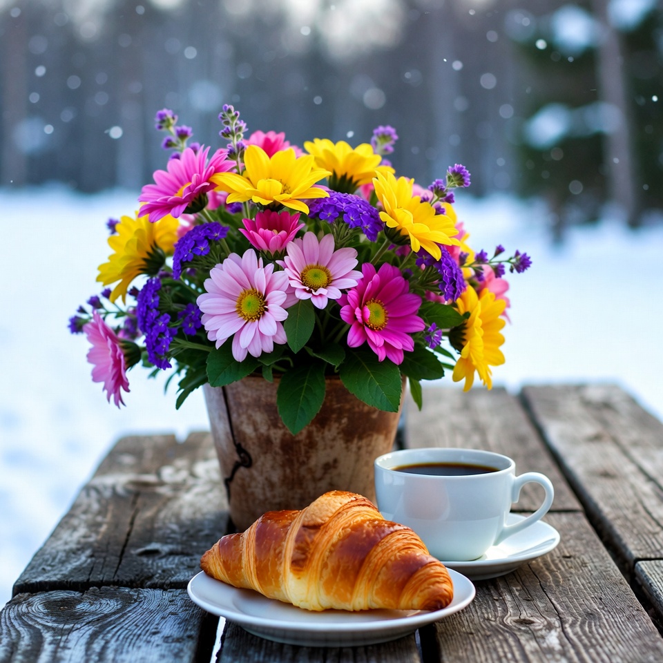 A table holds a pot of flowers, a cup of coffee, and a croissant. Snow falls softly in the background, creating a winter scene.