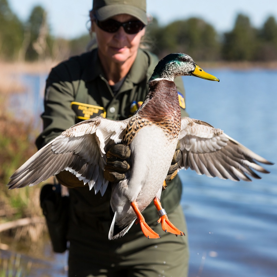 animal, bird, conservation, duck, environmentalist, flapping wings, green uniform, habitat, hands, lake, nature, outdoors, park, release, rescue, sunny day, water, wetlands, wildlife, woman