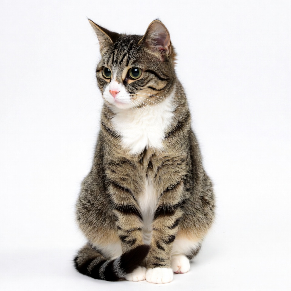 A striped cat with white fur on its chest sits upright on a plain white surface, looking attentively to the side.