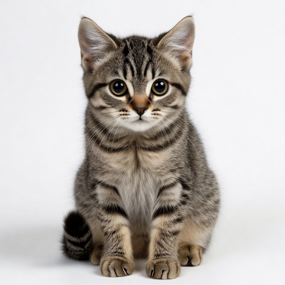A small striped kitten sits straight, looking ahead at the camera. The background is plain and white, highlighting the kitten's features.