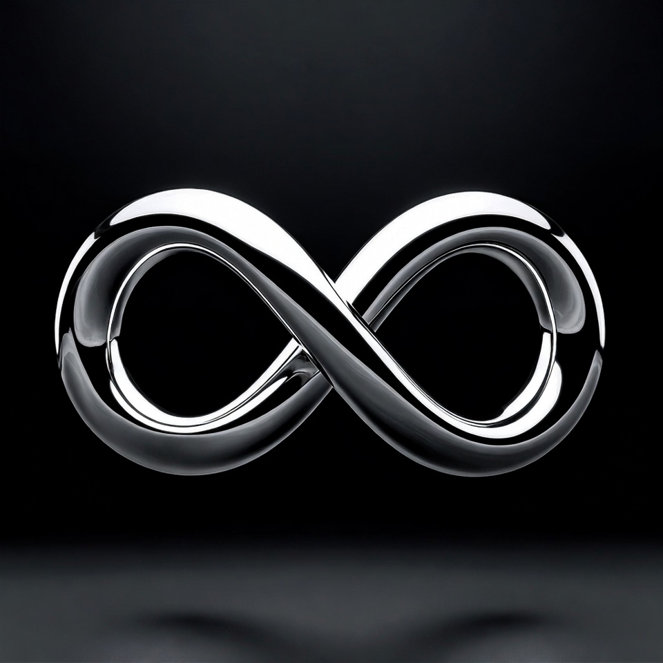 A shiny silver infinity symbol floats against a black backdrop, showcasing smooth curves and a reflective surface. The design highlights continuity.