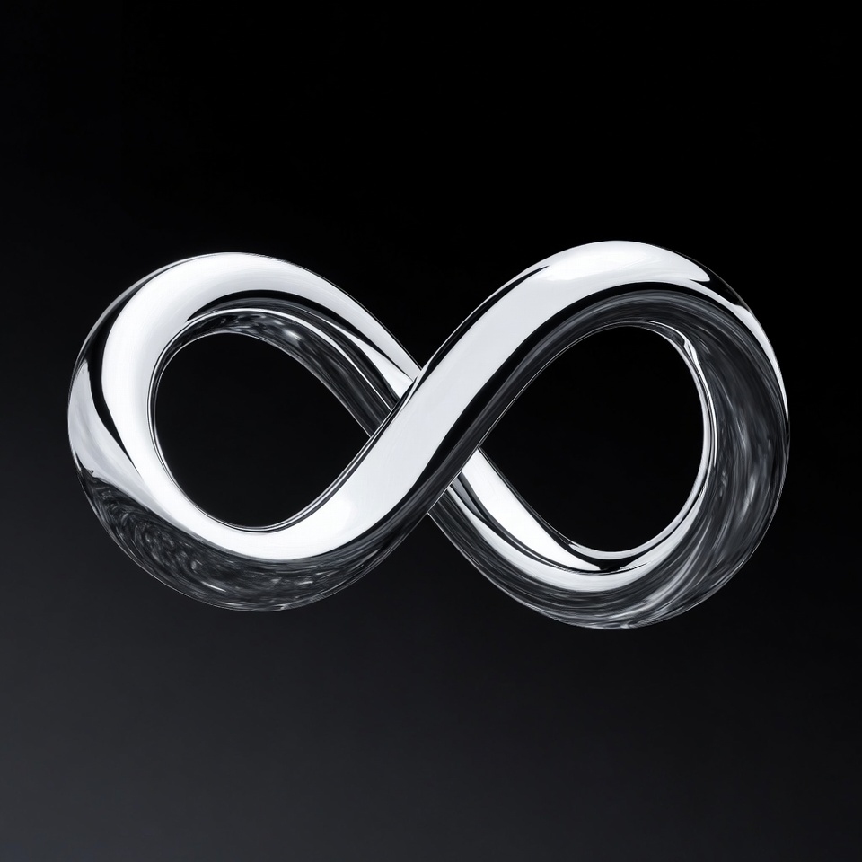 A glass art piece is shaped like the infinity symbol. Its smooth curves catch light and reflect shadows in a dark setting.