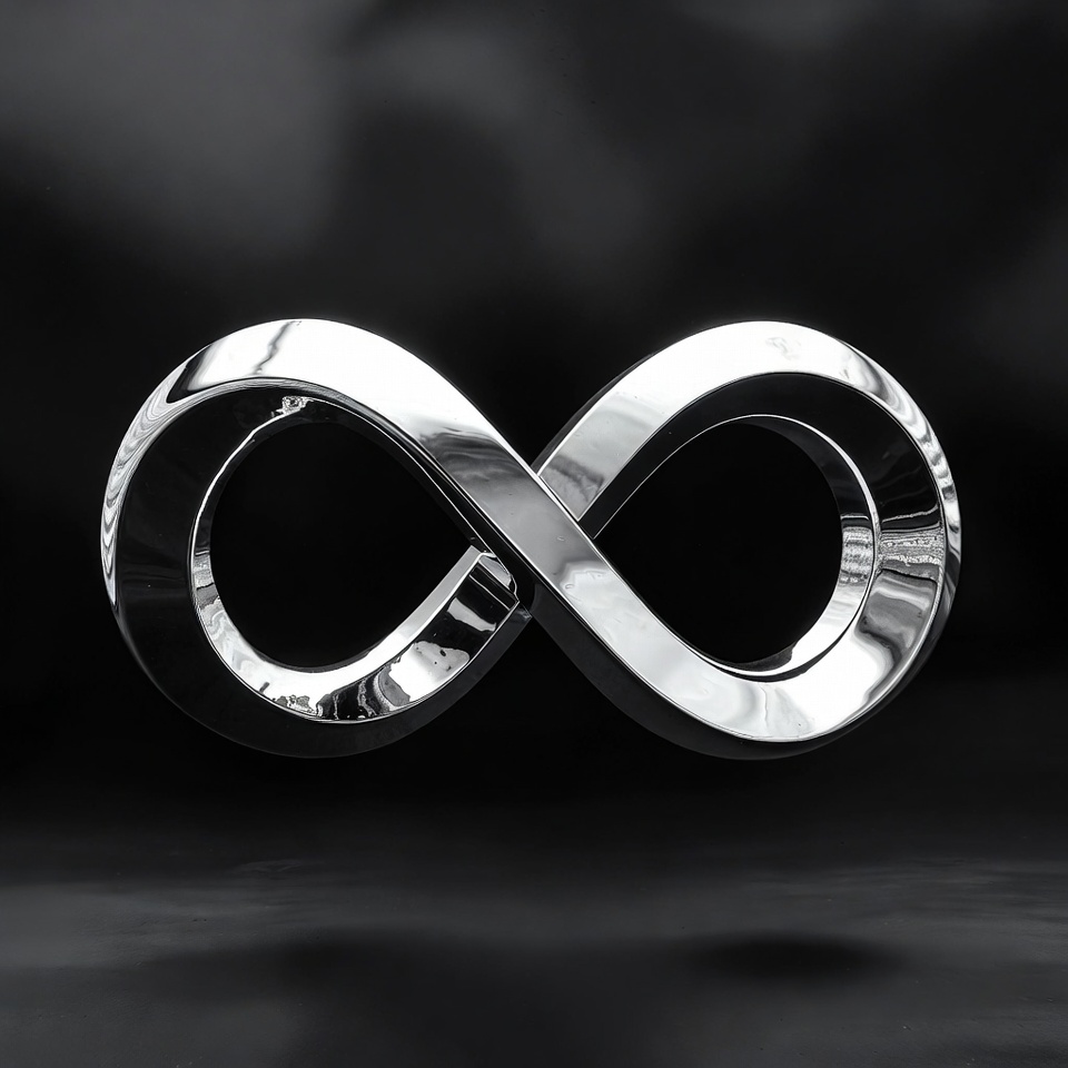 A reflective infinity symbol sits on a black surface. The design emphasizes the endless loop, showing a sleek and modern look.