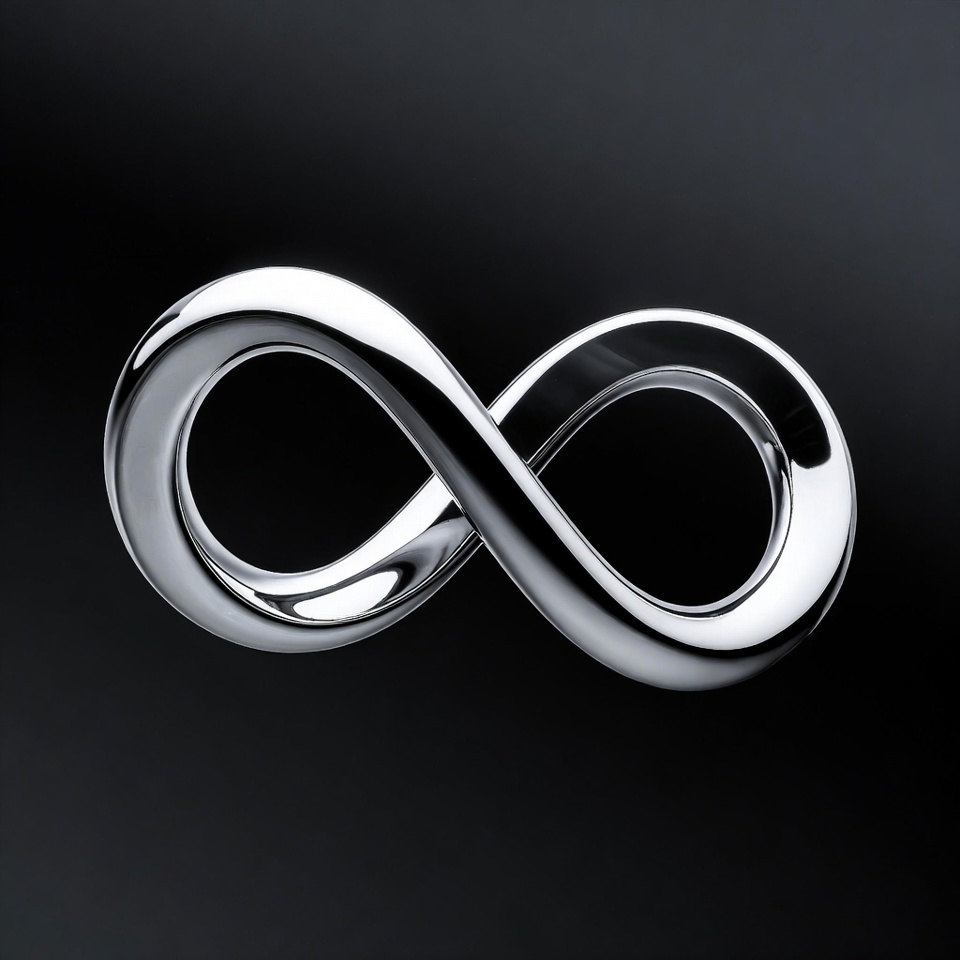 A shiny metal infinity symbol sits against a dark background. The design shows smooth curves and a polished surface, capturing light.