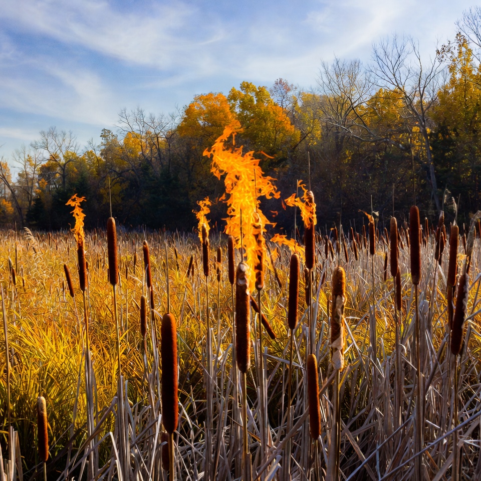autumn, bright, brown, burning, cattails, field, fire, flames, foliage, grass, landscape, nature, orange, outdoors, plants, rural, scene, sky, trees, wildlife