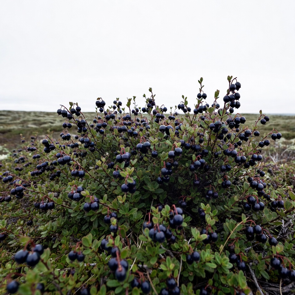 Blueberry bushes grow in an open area. The sky is overcast and the landscape stretches in the background.