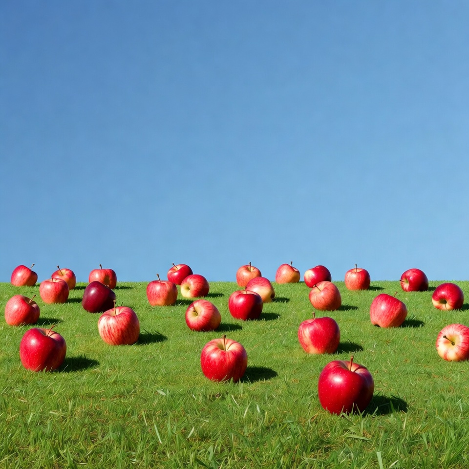Red apples are spread across a green grassy field under a clear blue sky. The scene shows a sunny day with no other objects.