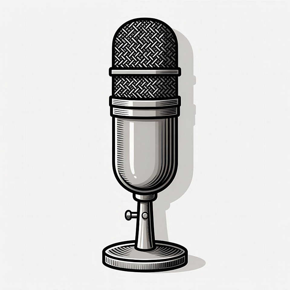 A vintage microphone stands on a round base. The design is classic and shows details like the mesh top and the smooth body.