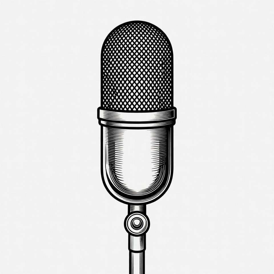 A vintage microphone is shown on a stand. The design features a mesh top and a shiny body. The setting is simple and focused on the microphone.