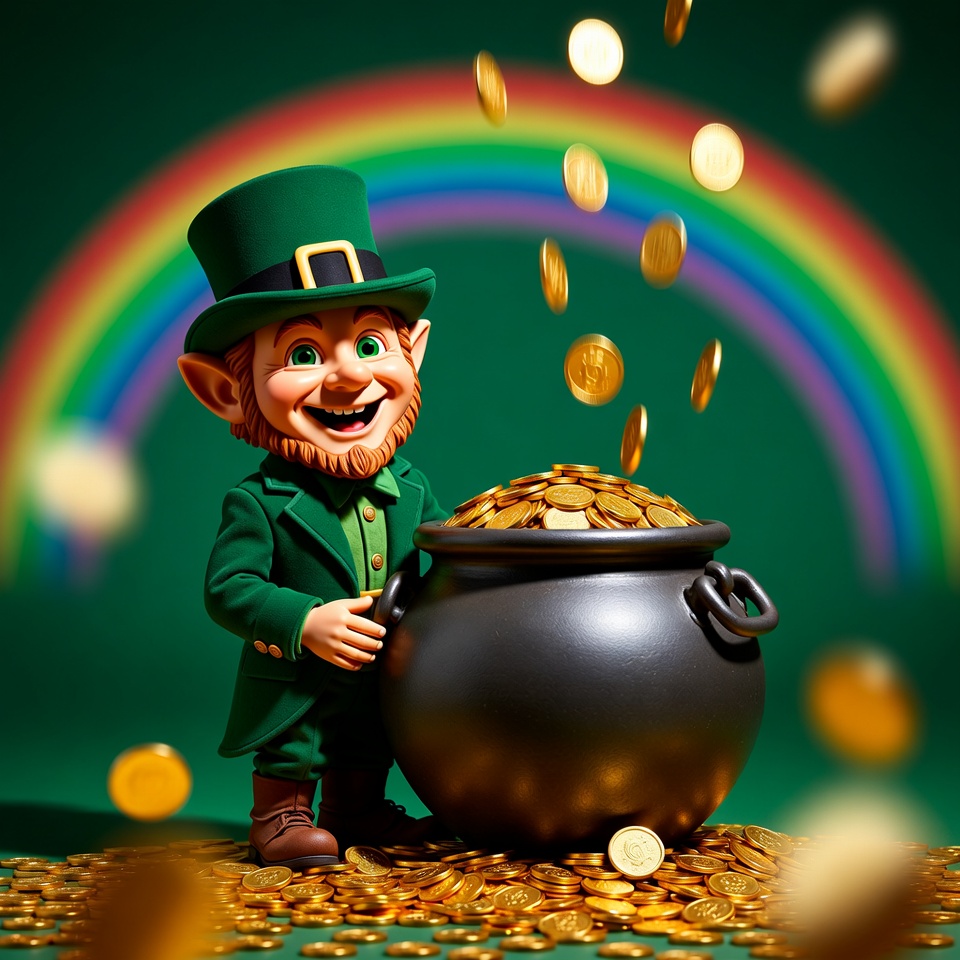A leprechaun stands by a pot filled with gold coins. Coins are falling from above. A rainbow is in the background, adding color to the scene.