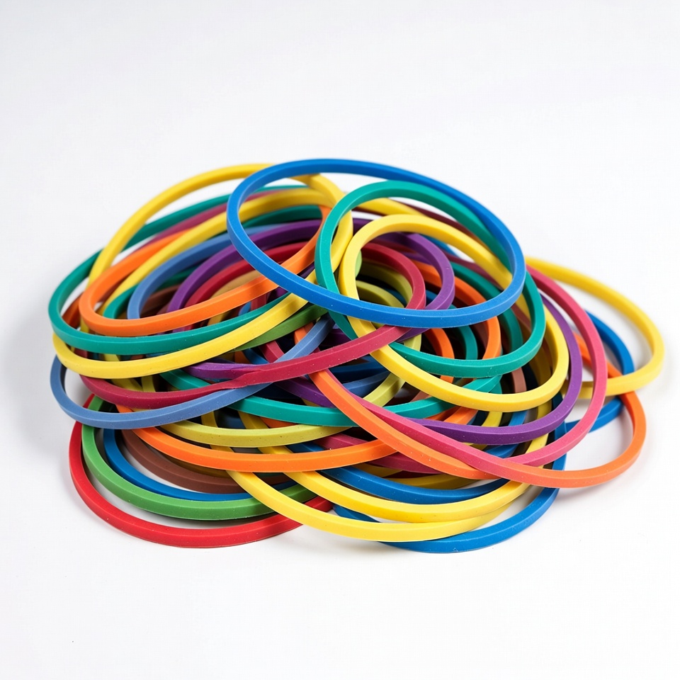 A pile of rubber bands in various colors lies on a white surface. The bands are of different sizes and styles, creating a vibrant scene.
