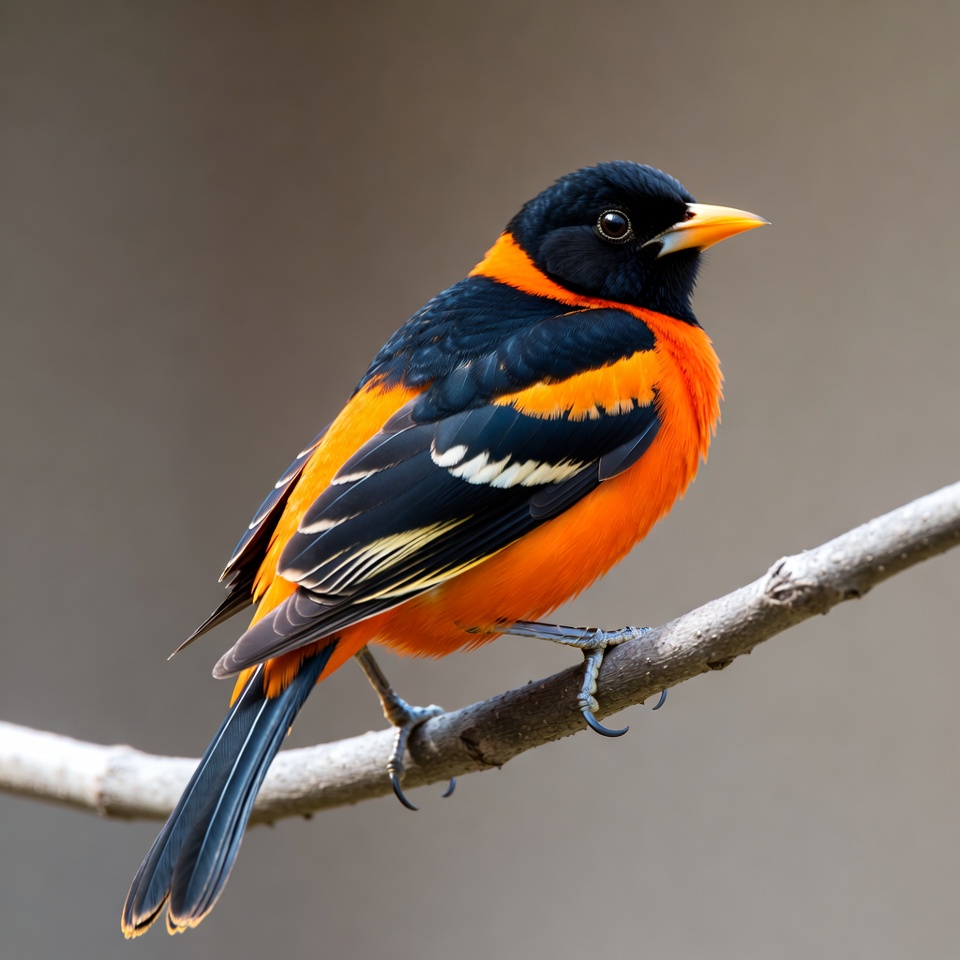 animal, avian, beak, bird, black, branch, colorful, daylight, environment, feathers, habitat, nature, observing, orange, outdoor, perching, songbird, tail, tree, wildlife
