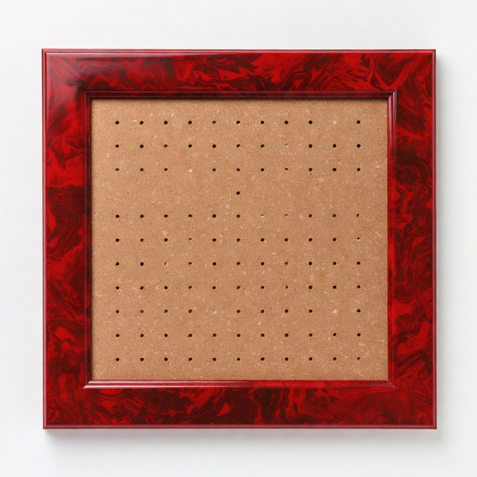 DIY, art display, art presentation, corkboard, craft supplies, crafts, creative project, decorative frame, display frame, empty frame, hanging art, home decor, interior design, modern decor, pegboard style, red frame, textured surface, versatile use, wall art, wall decor