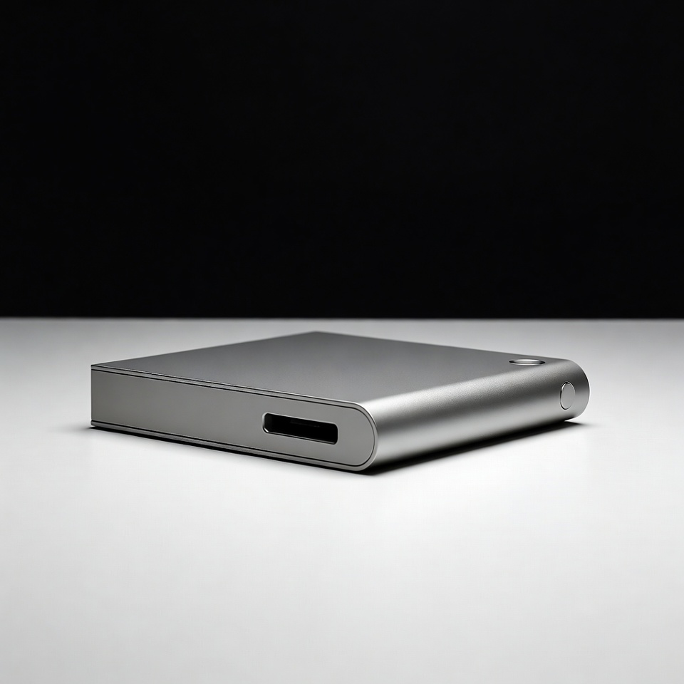 A sleek metal device rests on a simple table. The surface is well lit while the background remains dark, highlighting its form.