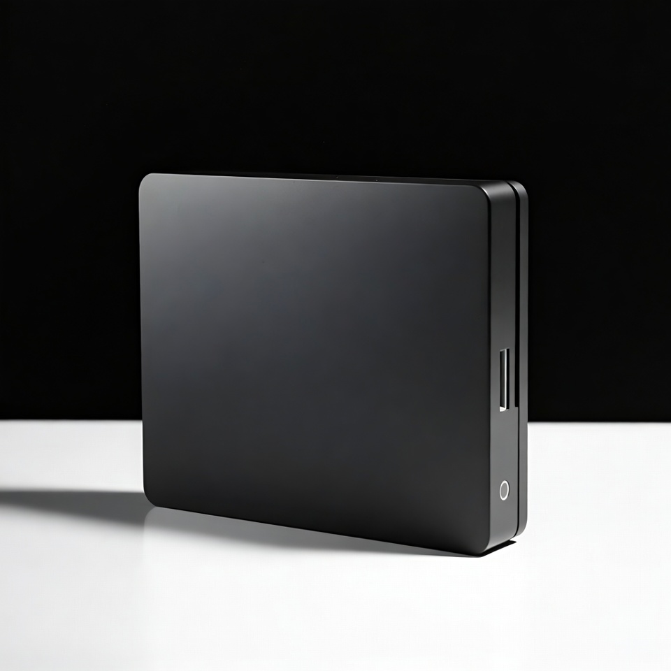 A black external hard drive is placed on a white surface. The background is dark, highlighting the device's shape and design.