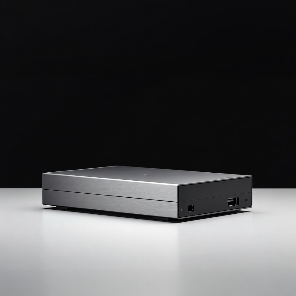 A black external storage device sits on a light table against a dark background. It is ready for use in storing data or backups.