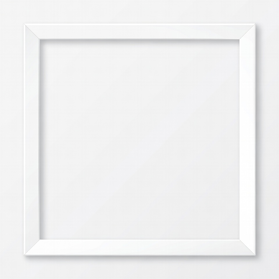 A square white frame sits on a plain white wall, providing a simple and clean backdrop for displaying artwork or photos.