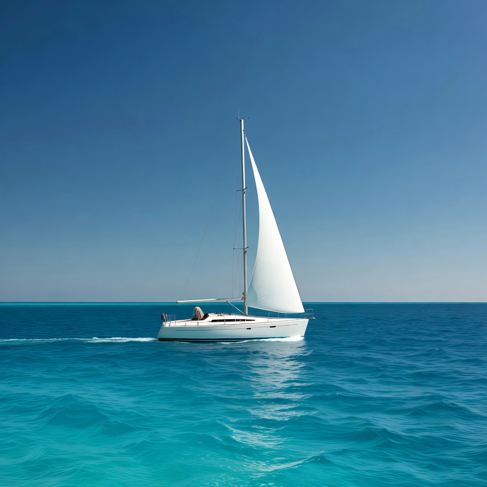 A sailboat moves across clear blue water under a bright sky, showcasing a peaceful day at sea with no visible land in sight.