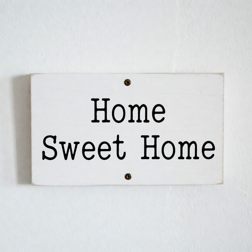 A wooden sign displays the words Home Sweet Home. It is mounted on a plain wall. The sign has black text and is light-colored.