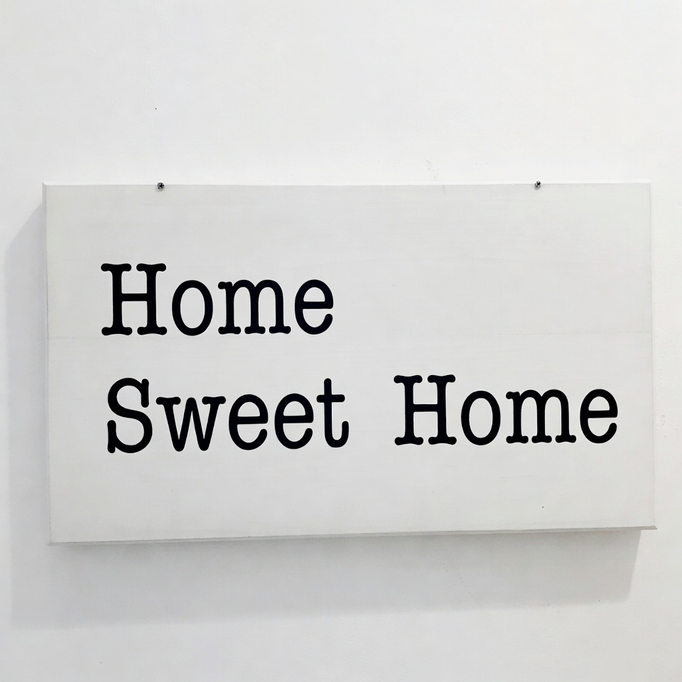 A sign with the words home sweet home hangs on a wall in a simple setting, conveying a warm and inviting feeling about domestic life.