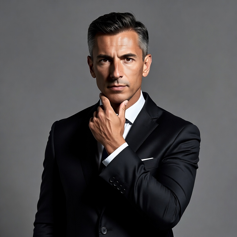 A man stands confidently in a black suit while touching his chin. He looks directly at the viewer with a serious expression.