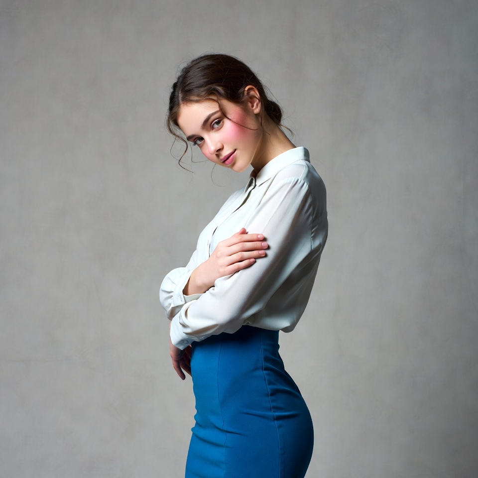 art, blue skirt, confidence, creative, elegant, fashion, female, hair, indoors, light shirt, lighting, model, portrait, posing, profile, smile, standing, studio, style, woman